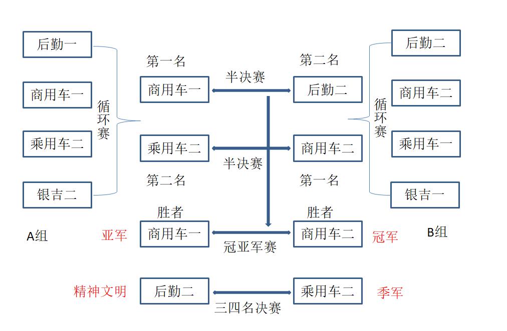 本次參賽的球隊有后勤一隊、后勤二隊、商用車一隊、商用車二隊、乘用車一隊、乘用車二隊、銀吉一隊、銀吉二隊共八支,通過抽簽分A、B組,由A、B組內循環賽勝出第一、二名進入半決賽,半決賽勝出者進入冠亞軍總決賽,半決賽負者進入三、四名總決賽,比賽規則采用國際規則進行。